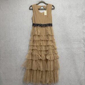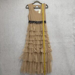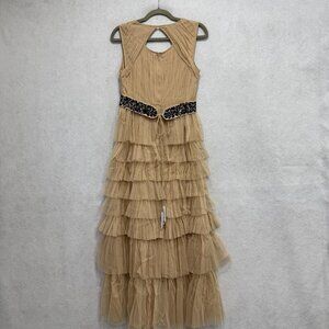 Sundance Dress Womens 8 Beige Tiered Ruffle Tulle Maxi Keyhole Back Velvet Belt