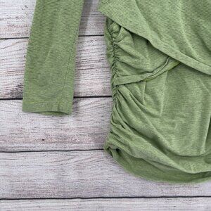 Features a soft stretch green fabric with subtle thin horizontal stripes, faux wrap front, flattering ruched/draped detail at sides and skirt, and long sleeves.