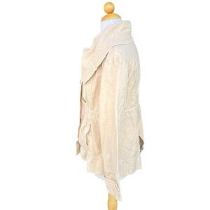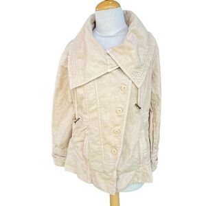 Sundance Every Angle Lightweight Jacket. Women’s size Petite Large. Light Tan color. Lightweight Cotton Linen blend. Button front, dramatic cinched collar. Great details on this coat! Great preowned condition!