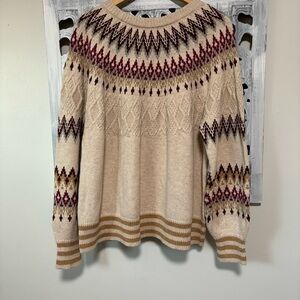 Sundance Fair Isle Cream/Tan Jewel Tone Cable Knit Scoop Neckline Sweater NWOT
