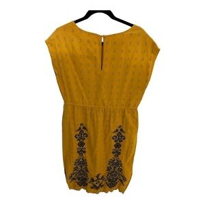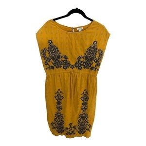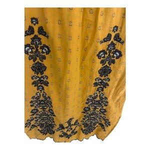 Lined Midi Dress Size S. Boho look with raw stitched pattern throughout. Gorgeous dress with beaded and sequined embroidered gray flowers. Scalloped trimmed hem. Side slits with cap sleeve. Shorter gold cotton lining and on-seam pockets. A lovely dress that will get compliments.