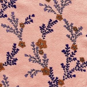 Pink/light coral background with blue/purple and burnt orange floral pattern