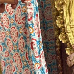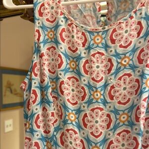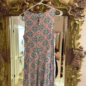 This elegant sundress by Sundance features a sleeveless design with a crew neck, perfect for a wedding guest or resort wear. The maxi length and flowing silhouette are adorned with a charming pink and blue floral pattern, creating a romantic and timeless look.