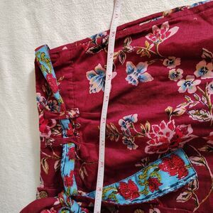 Vibrant boho floral A-line midi skirt featuring a button front, tie waist, and colorful border hem. Flowy and feminine perfect for summer, vacation ,or festival wear.