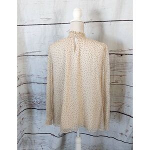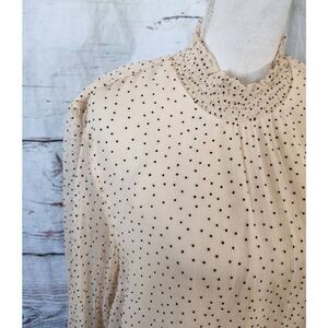 Long sleeve cream color and black polka dot blouse with smocked neckline. Sheer sleeves. Chiffon type fabric. In very good condition.