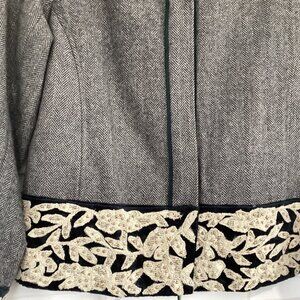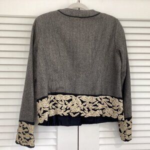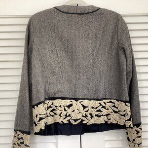 Elegant gray blazer with black trim. Features cream floral embroidery. Perfect for formal occasions.
