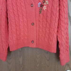 Sundance Hot Pink Floral Embroidered Cable Knit Cardigan Sweater Medium