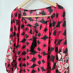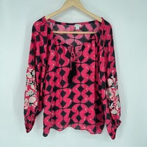 Gorgeous perfect for spring, summer, fall! Bright colors and embroidered balloon sleeves. Tie neck. Size small.