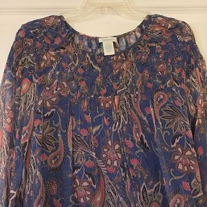 Sundance Indigo Floral Paisley Sheer Blouse, size XS. Elegant sheer blouse featuring a vibrant floral paisley design. Perfect for adding a touch of color to your wardrobe. Lined body. Sheer sleeves. Dry clean only.