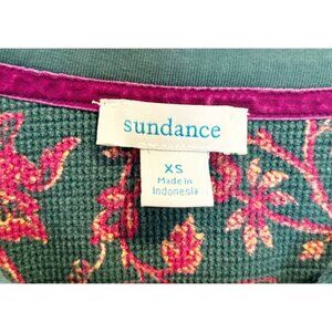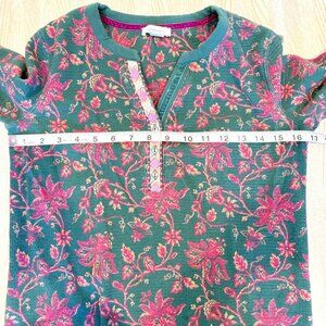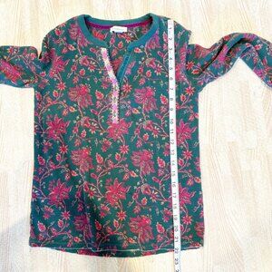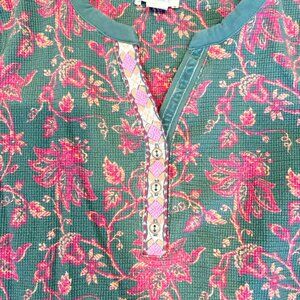 Poinsettia-inspired print with tribal-embroidered placket, antique metal buttons, rounded hem, knit cuffs. Cotton/spandex. Machine wash.