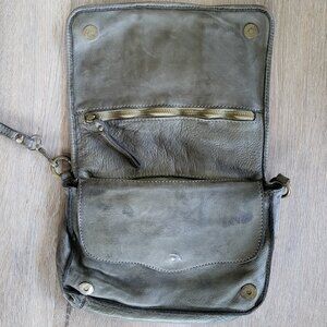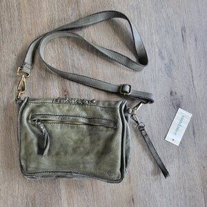 Sundance Jet Set Crossbody Bag with fold over flap made of a buttery-soft leather in an olive/ mossy green color. Converts to a fold over clutch or wristlet. Tons of zippered storage and pockets