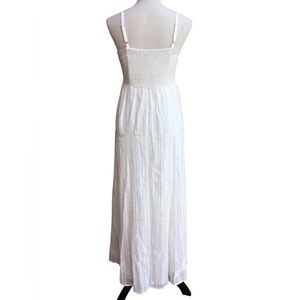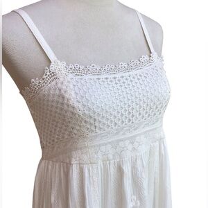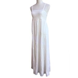 This Sundance Ivory Lace Embroidered Maxi Dress in size XS features a square neckline, pullover closure, and sleeveless strappy design. Made of cotton and polyester, it is adorned with delicate embroidery and has a long dress length. The dress is lined, smocked, and adjustable, perfect for summer or spring occasions like travel, parties, or casual wear with a bohemian, peasant, or romantic theme. Hand wash only.