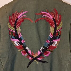 Features intricate embroidered details: geometric floral pattern on front chest pockets and a vibrant multicolor heart-shaped feather motif on the back