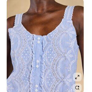 Delightfully textured, our yarn-dyed camisole boasts pinstripes, contrast eyelet embroidery, ladder lace inserts, scalloped neckline, tiny ruffles at placket and shell button front. With elastic back for comfort and buttons down the front.