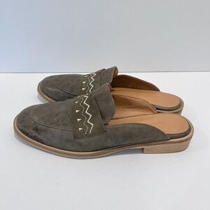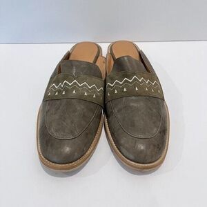 Sundance Leather Embroidered Mules Size 38 = 8 Women's Green Pewter Flats