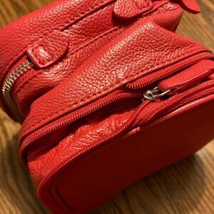 Red jewelry case features an expandable bottom zipper and six interior storage pockets - 3 attached, 3 removable - with the lower-case letter R on top.
