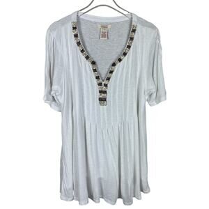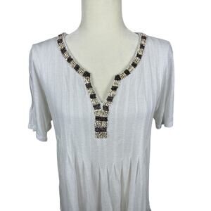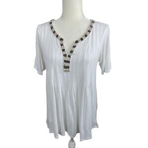 Linen viscose blend tunic top with embellished beading to v-neckline. Seaming detail to front and short sleeves. Top is front lined. Flowy hemline. 79% viscose, 21% linen. Size small