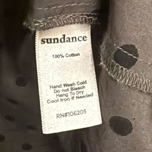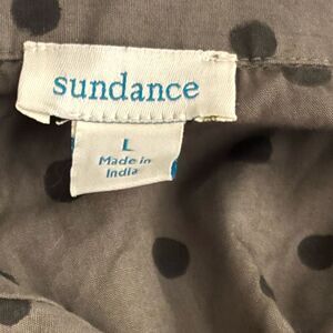 This is a preowned green polka dot tunic by Sundance. It has buttons at the front and a pin tuck detail with a collar and long sleeves. No holes stains or flaws.