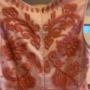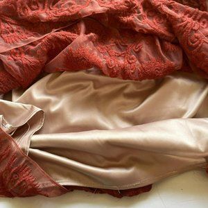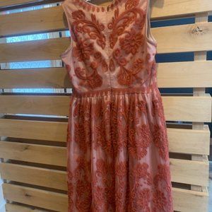 Fit and flare, knee length dress in a rust color. Lining is a satin nude color covered with a rust-colored mesh with an embroidered floral design. Beautiful and unique dress.