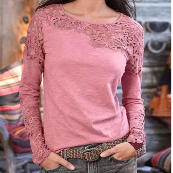 Sundance Lovelier Days Mauve Pink Floral Lace Long Sleeve Tee Top M Cutout Boho