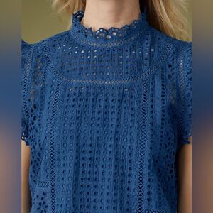 Our super textural top can be dressed up or down and is a great layering piece as well. An eyelet patchwork with ladder lace inserts, ruffle neckline and sleeves and a sophisticated keyhole shell button at back. Camisole included. Cotton. Machine wash. Imported. Exclusive. Sizes XS (0-2), S (4-6), M (8-10), L (12-14), XL (16-18), XXL (20-22). Approx. 25"l.