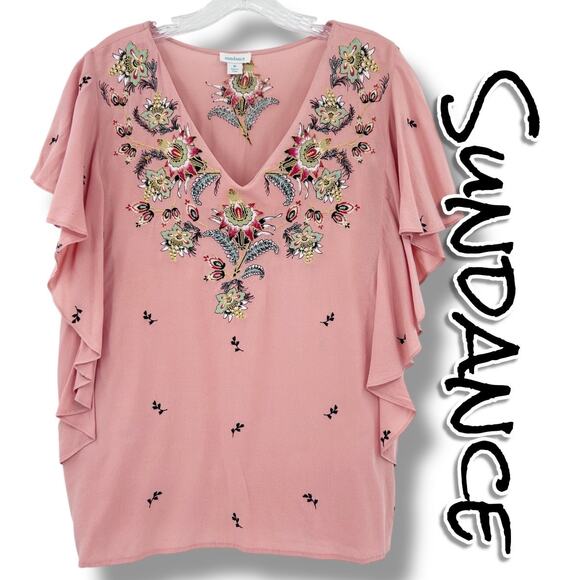 Sundance Magdalena womens blouse in pink. Intricate multicolor floral embroidery along the neckline and back. Designed in a soft blush pink rayon with flutter sleeves and a flattering V-neckline. Lightweight and flowy with a relaxed bohemian silhouette, perfect for warm weather or layering year-round. Size medium. Excellent used condition. No flaws detected. See measurements for proper fit.
