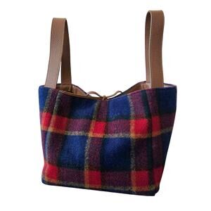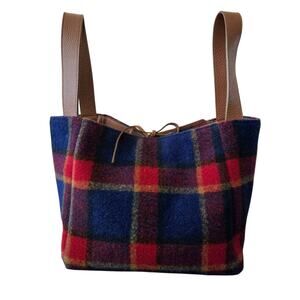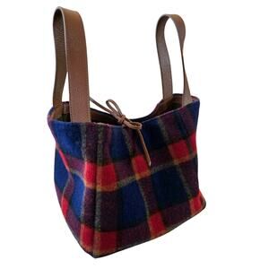 Sundance Maple Glen Tote Red Blue Plaid Wool Felted Leather Handbag Purse Preppy