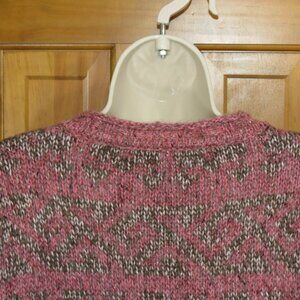 Great casual sweater from Sundance. Colors are salmon pink, brown, light grayish, and a smattering of a silver metallic thread.