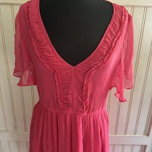 EUC Sundance Monaco V Neck Ruffle trim Meet Up dress Chic fuchsia dress with lace accents. Features a V-neck and tiered skirt. Ideal for stylish outings.