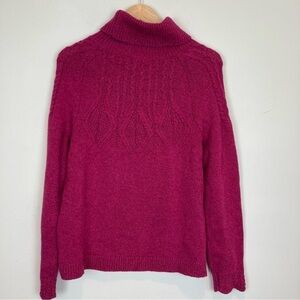 Sundance silk blend mountainview sweater with turtleneck, cable knit and scalloped sleeves. Cerise color. Deep fuschia pink. Sold out online. Size petite medium.