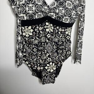 Complimentary prints in classic black and white flatter in this V-neck swimsuit, accented with solid under-bust band and removable shoulder ties. Built-in cups. Nylon/spandex.