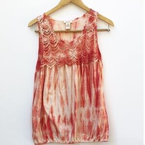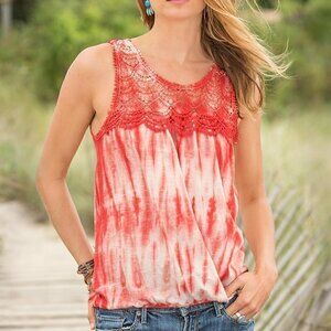 Delicate, crocheted scallop lace paired with a loose and easy tie-dye