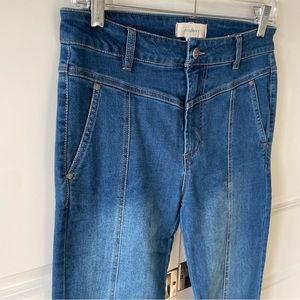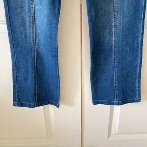 So flattering and stretchy, kick flare style jeans with front and back seaming to elongate the legs. Slight fading.