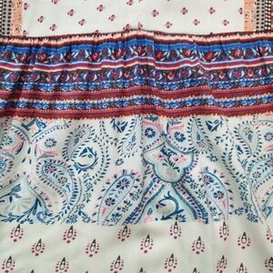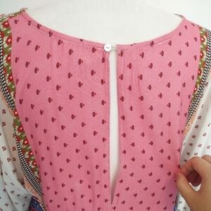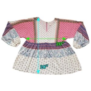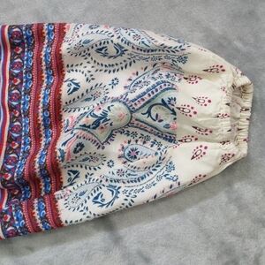 Good used condition, with no stains or tears. A multicolor boho top, with abstract shapes, including paisley. The base color is cream. Has a v-neck and long puff sleeves with elastic cuffs. Has a keyhole/button back collar.