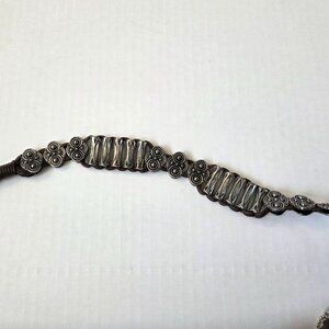 There is wear/tarnish to the mateal accents, please check the photos for the close ups. The strap is assymterical so one side has the metal accents, the other side is multistrand leather.