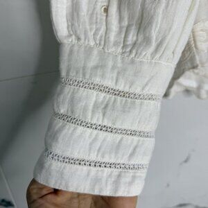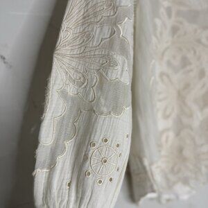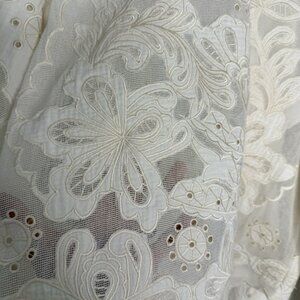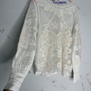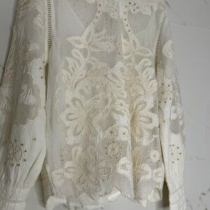 The Sundance Reach For Beauty Top in XS is a stylish and bohemian women's blouse featuring a floral pattern in marshmallow ivory color. Made of lightweight cotton lace fabric, this top has long sleeves and a round neckline. It is accented with crochet, ruffle, and embroidered details, perfect for a festival, beach, or peasant-inspired look. The bohemian theme and sheer features make it a versatile piece for any season. Ideal for those who appreciate a blend of traditional and modern styles in their wardrobe.