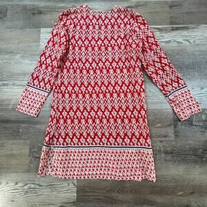 Lightweight tunic dress by Sundance in a red and white ikat-inspired print with floral embroidery at the neckline. Made of breathable 100% cotton with long sleeves, side slits, and contrast borders at cuffs and hem. Can be worn as a dress or a swim coverup.