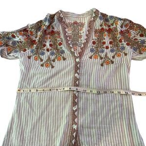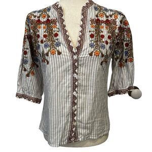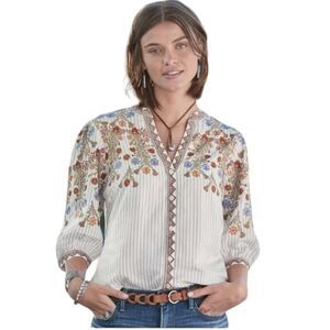 This elegant blouse from Sundance features a mandarin collar and is adorned with a beautiful floral print in red and brown hues. The embellished design and buttoned style add a touch of sophistication, making it perfect for both casual and dressy occasions.