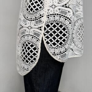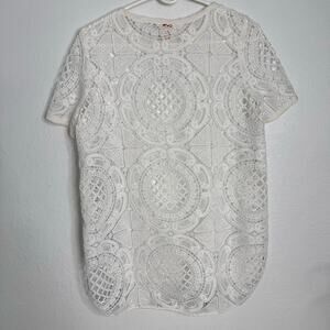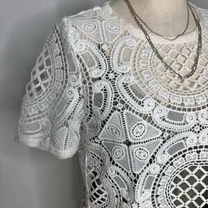 Stunning white crochet lace top. Features intricate openwork detailing in circular and geometric patterns, short sleeves, and a lightweight sheer design—perfect for layering over tanks, bralettes, or swimwear. Ideal for festivals, vacations, or coastal cowgirl summer looks. Soft, breathable, and effortlessly boho.
