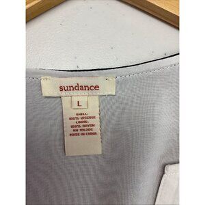 The Sundance Sheer Chiffon Layered Tunic Top in black is a stylish and flowy blouse perfect for casual occasions. Made from viscose/rayon chiffon fabric, this sleeveless top features a V-neckline and a relaxed fit. The sheer fabric adds a touch of elegance to this tunic, which is designed for a regular size large women. Ideal for layering or wearing on its own, this top from Sundance is a versatile addition to any wardrobe.
