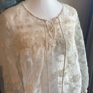 Ethereal sheer cream floral embroidered blouse with tie detail and elastic ruched cuffs #boho #romantic #feminine #70s #fairycore
