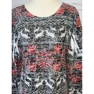 Sundance Shirt Long Sleeve Crew Ugly Christmas Tee T-Shirt Top size Large. Gray, white and red in color with deer and snowflake design having a burnout pattern. 50% Cotton 50% Polyester. Machine washable. Pit to pit 20.5", pit to end of sleeve 19.25", shoulder to end of sleeve 25", back bottom of collar to bottom of shirt 23.5". Great preowned condition with no rips or stains. perfect for the holiday office party, ugly christmas sweater, black friday shopping, photo shoot.