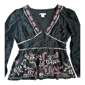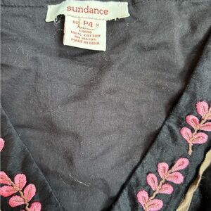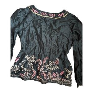 This elegant blouse from Sundance features a striking black base adorned with delicate pink embroidered embellishments. peplum style add a touch of sophistication, making it a versatile choice for both casual and formal occasions. The intricate detailing along the neckline and edges enhances its feminine charm.