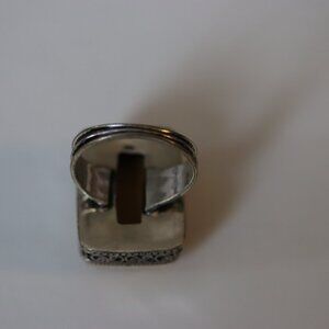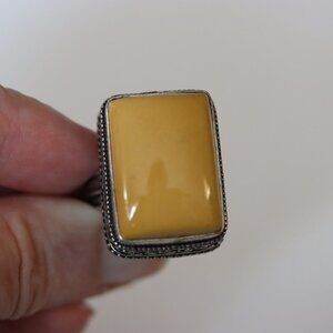 Sundance purchased silver ring. Size 8. Not adjustable. Yellow stone. Don't know what type. 925 stamped on inside of ring. Mint condition. 3/4" x 1". Has filigree edging around where the stone is set.