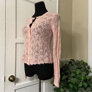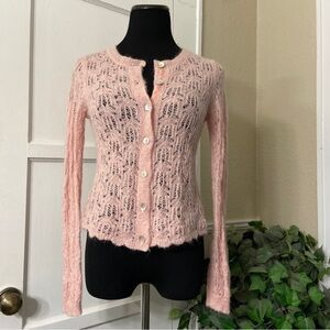Light Pink, open knit pattern, scallop hem, button down, shell buttons. Beautiful, feminine, lightweight button down sweater. Excellent pre-owned condition.