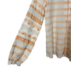 Sundance Sunset Stripes Top. White and orange striped long sleeve blouse. Lace up detail. Tonal embroidery and lace insets on sleeves. Elastic cuffs.
