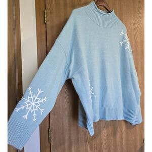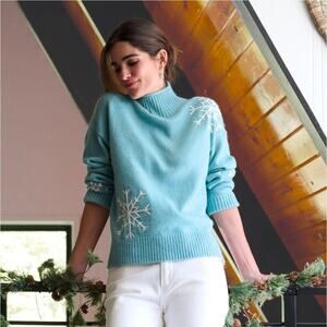 Keywords: Sundance, knit, snowflake, winter, high neck, casual, capsule, staple, cozy, Christmas, holidays, preppy, warm, plus size, soft, light blue, , classic