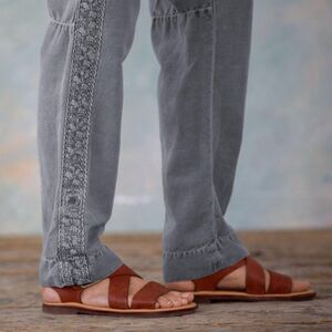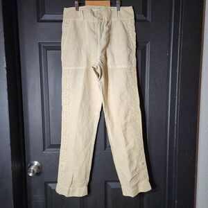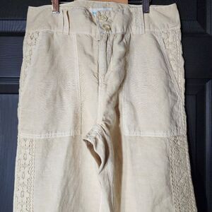 Relaxed-fit, lightweight linen/cotton pants are winners, with roll-tab cuffs for converting to capris and lace trim detail at side seam. Machine wash. Waist measures 15" across. 30" inseam unrolled, 25" inseam rolled. NWT. Excellent new condition. Color: Sand.