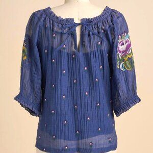Our airy and flowy top is so feminine, with vintage-inspired embroidery, lace inserts all around the notch neckline with ties and full, elastic cuff raglan sleeves.