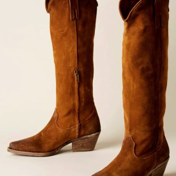 NEW IN BOX - never worn. Western style burnished suede boot w/side zip made in Italy. Snipped western toe. Very slouchy style - shaft is unlined and slouches down for a very relaxed casual look. This boot is soft and slouches down! Suede pull tabs, 2 - 2.25" western style heel, 17" unlined shaft at tallest point, 16' top of shaft circumference. Perfect to wear over jeans or with dresses for a relaxed extra slouchy look. Very nice quality cognac color suede. This is a very cool twist on the classic western boot.
